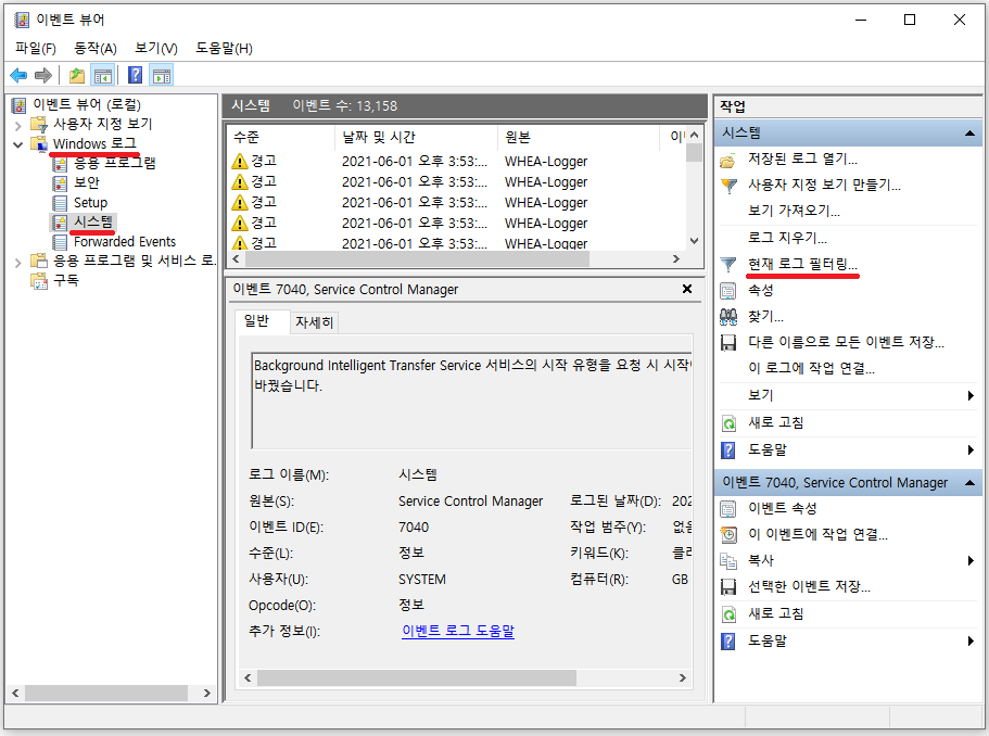 3. 열리는 이벤트 뷰어 창 왼쪽에서 [Windows 로그]-[시스템] 순으로 클릭한 다음, 우측에 있는 [작업] 목록에서 [현재 로그 필터링]을 선택합니다.