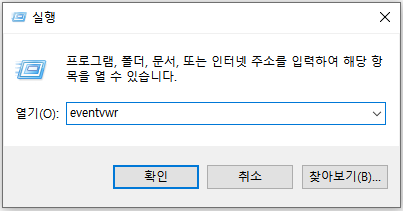 2. 열리는 실행창에 eventvwr를 입력하고 엔터를 칩니다.