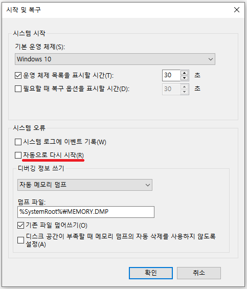 4. [자동으로 다시 시작]에 체크가 되어있는지 확인합니다. 체크가 되어 있다면 체크를 해제한 확인을 눌러 창을 닫아주세요.