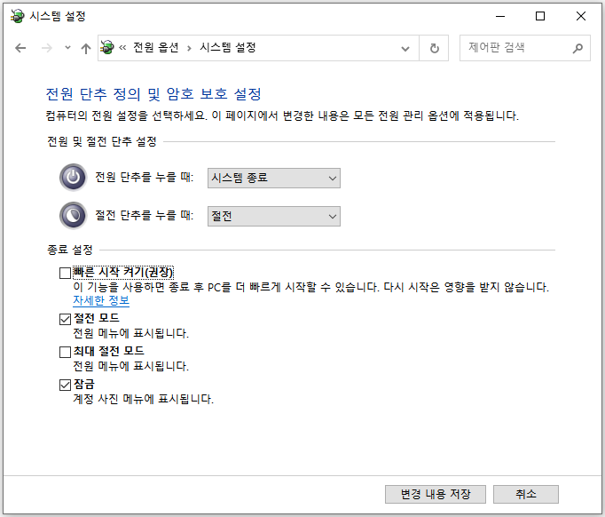 빠른 시작 켜기 기능 비활성화
