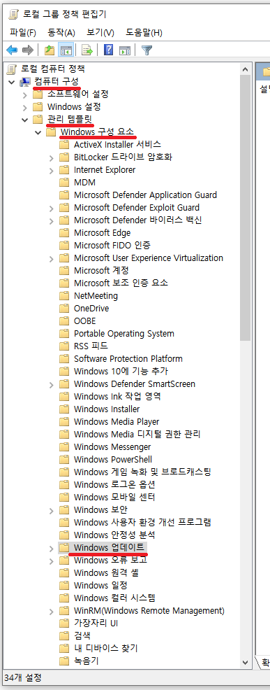 3. 열리는 로컬 그룹 정책 편집기 왼쪽 트레이서 [컴퓨터 구성]-[관리 템플릿]-[Windows 구성 요소] 순으로 선택합니다.